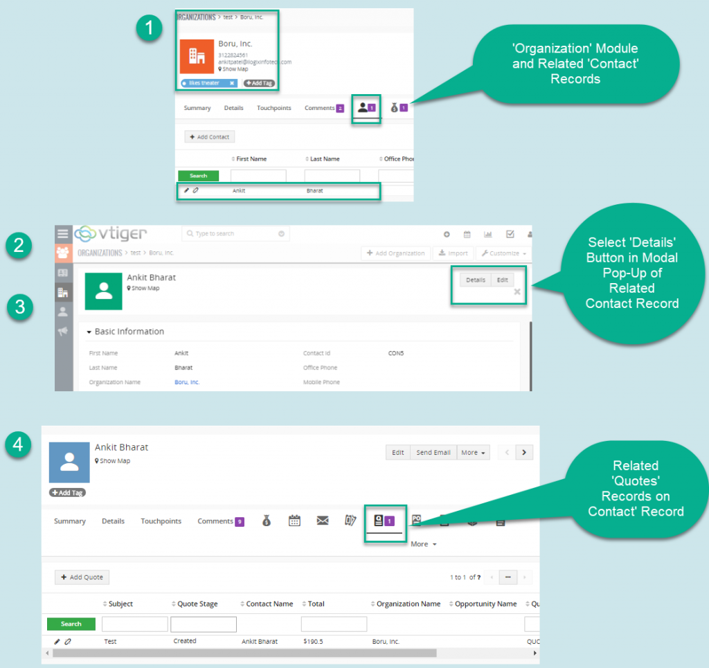 They find there is different way to get to related ‘Quotes’ records because of the Vtiger 7 modal pop-ups. Compare that to Vtiger 6 where you can find related ‘Quotes’ records on the right hand side of the related ‘Contacts’ record.