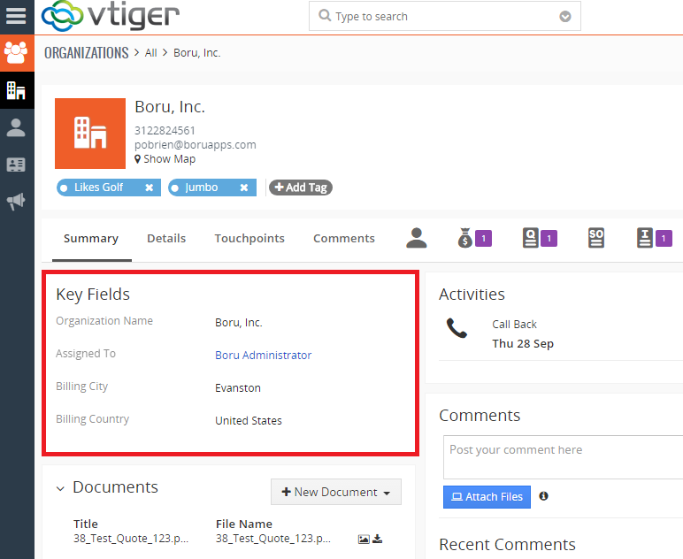 Key Fields are shown at the top of the summary view in most module records. This includes the records in Organizations, Contacts, Leads, Quotes, Opportunities, Sales Orders, and more.