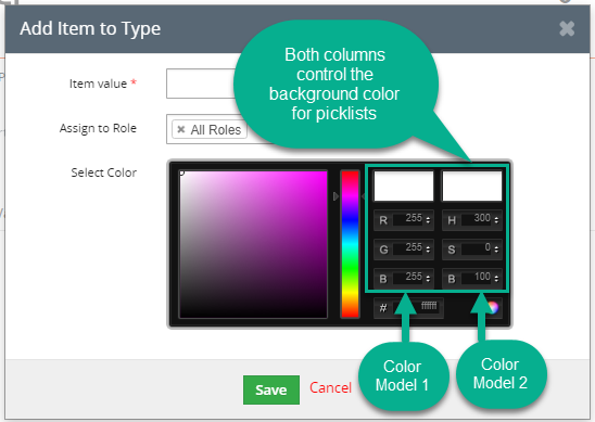 When you are setting up the picklist colors, you might think the two columns are the font color and the background color. In reality, both columns control the background color. Depending on the background color, the font color is either white or black.